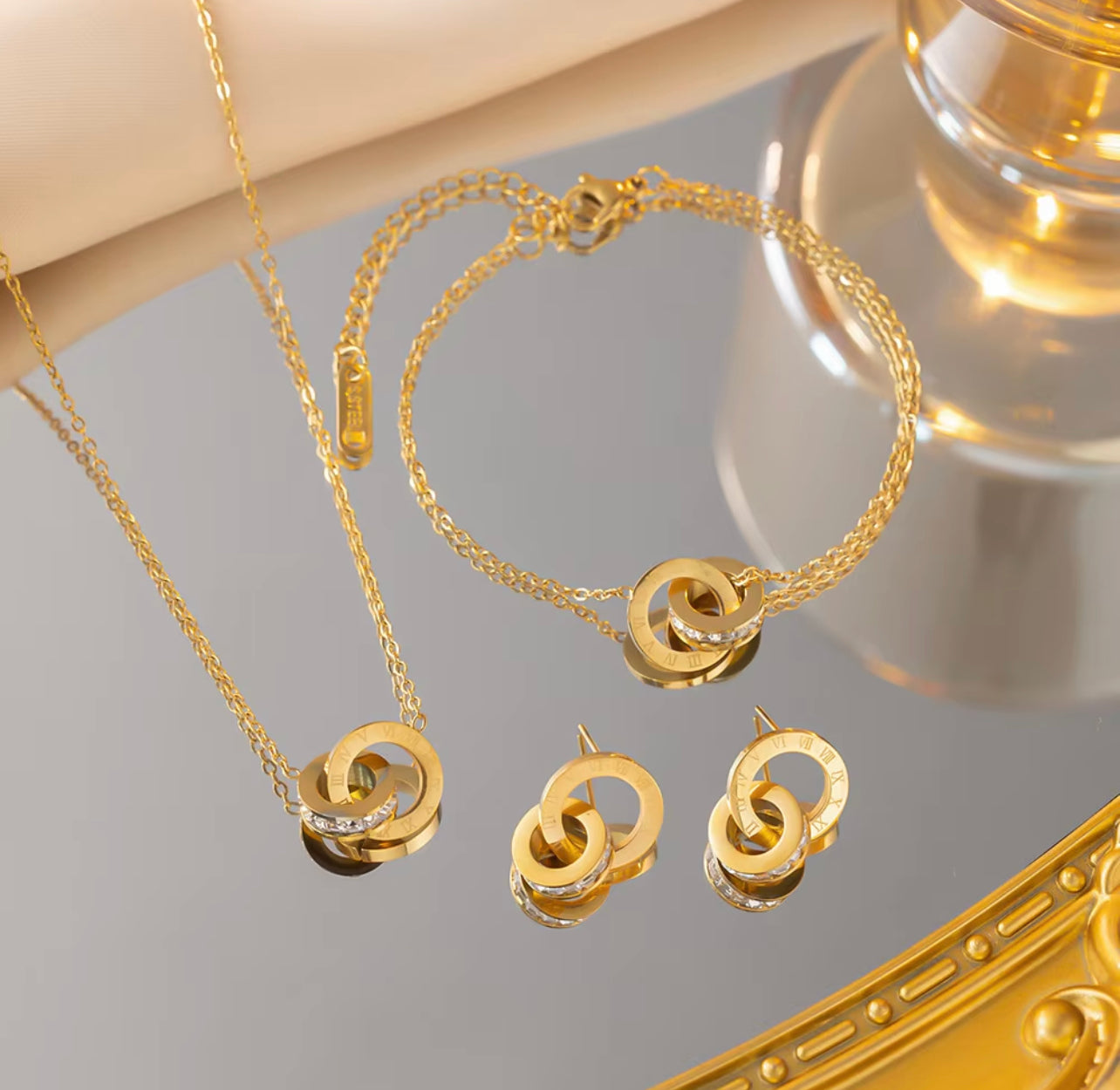 Premium Quality Stainless Steel 18k Roman Numerals Stone Studded 3pc Set